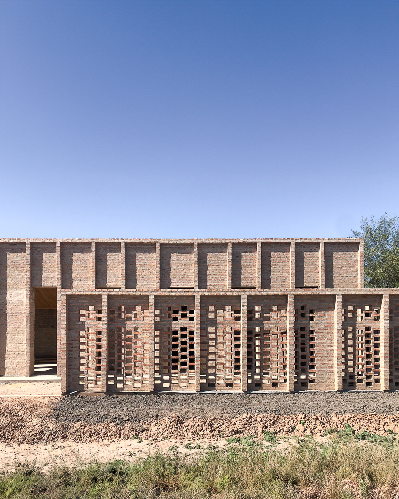 The building follows a strict constructive grid of 975mm defined by the standard dimensions of the locally produced bricks – the clay is excavated and baked on site.