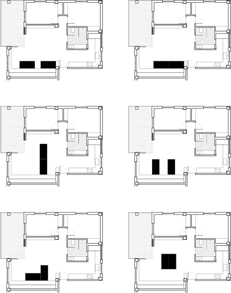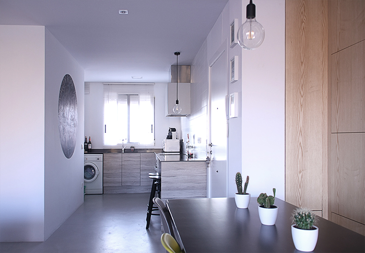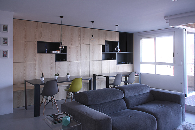 Refurbishment of a 90m2 apartment. The main space is cleared, expanded and opened towards the views of the near Mediterranean sea. The new corner window allows better views and blurs the boundaries between inside and outside connecting the living space with the terrace. The new layout enforces cross ventilation utilising the sea breeze for clima control.